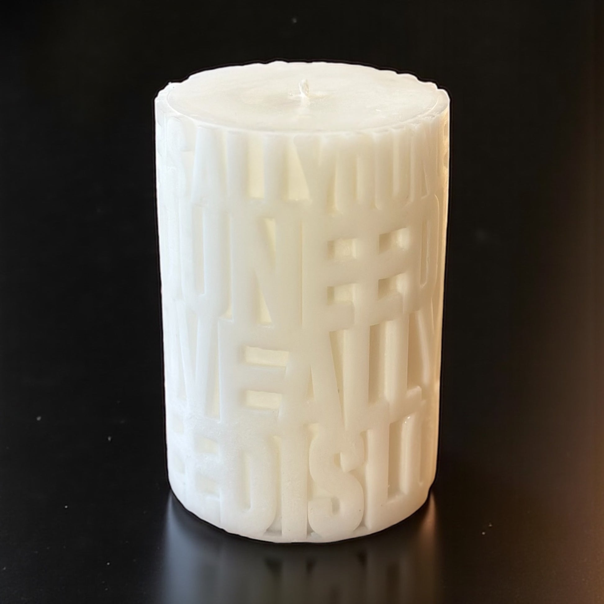 Cette Bougie Colonne avec du texte 3d au design épuré est en cire végétale.